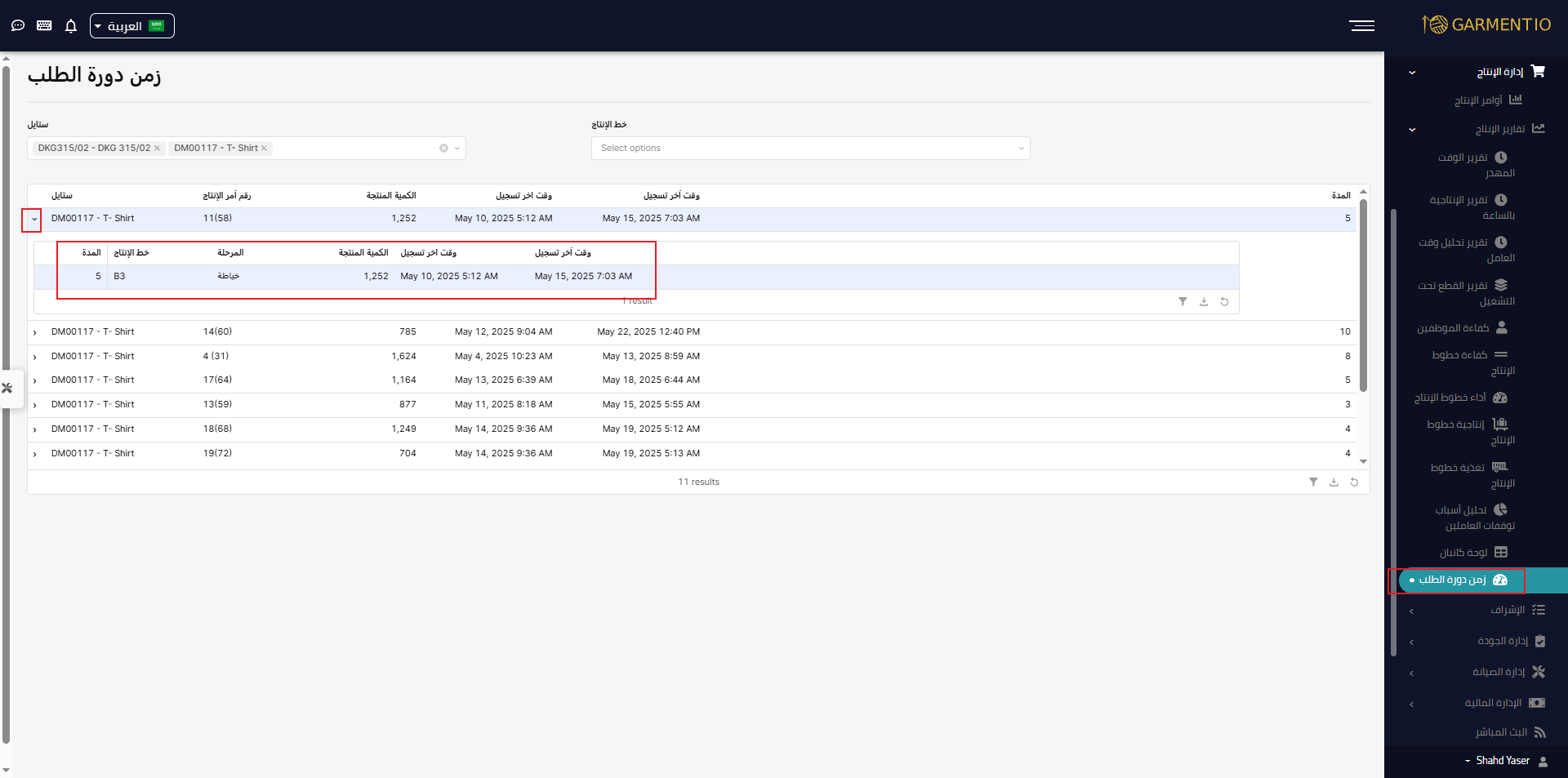 يتيح هذا التقرير معرفة المدة الزمنية التي يستغرقها كل أمر إنتاج منذ البداية حتى النهاية.