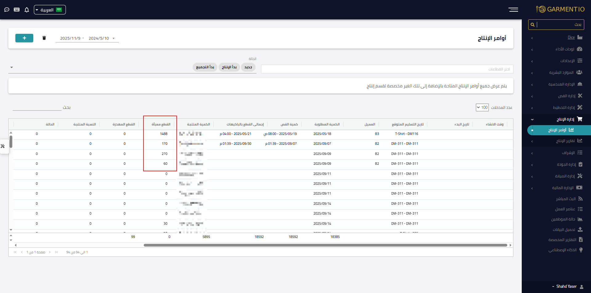 الموديل وأمر الإنتاج والكمية المنتجة