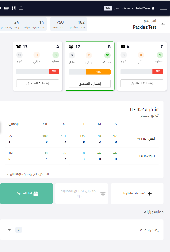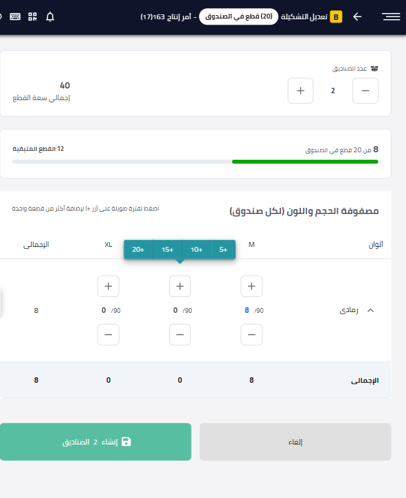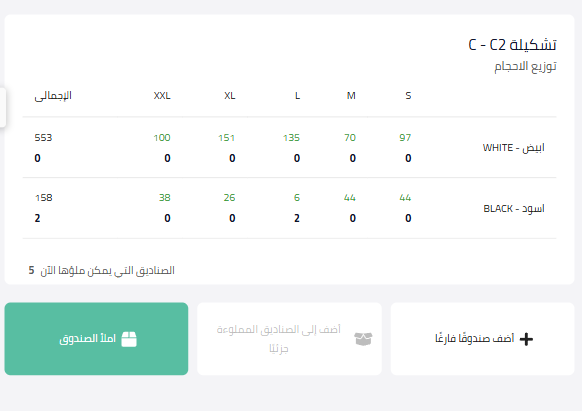 يكون المعروف فقط هو سعة الصندوق (عدد القطع في كل صندوق)، أما توزيع الألوان والمقاسات فيتم تحديده أثناء التعبئة الفعلية على التابلت.