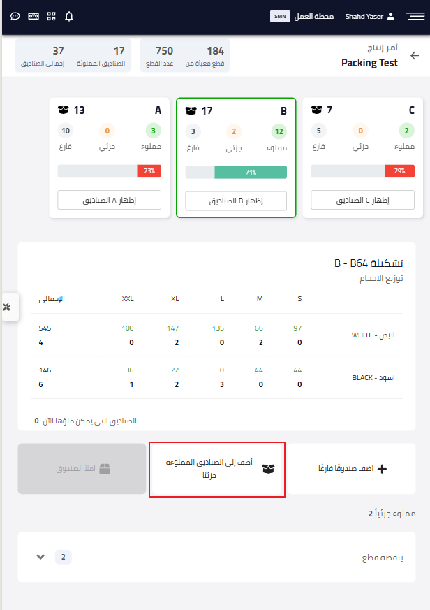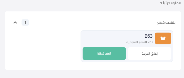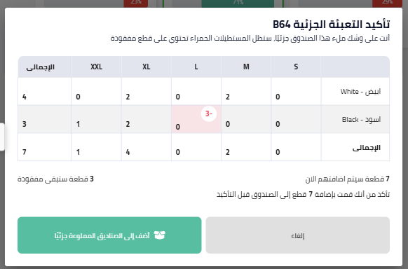 عند اختيار “اضف إلى الصناديق المملوءة جزئيا”، تُعرض القطع المضافة باللون الأسود والقطع المتبقية باللون الأحمر.