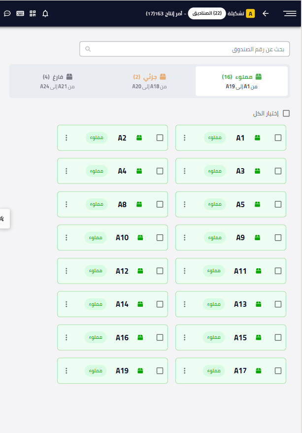تحديد عدة صناديق لحذفها أو إلغاء تعبئتها (Unfill) لإرجاع القطع إلى حاوية “جاهز للتعبئة”.