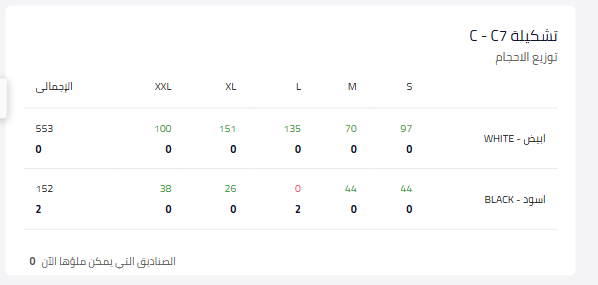 أسفل بطاقات التشكيلات، تظهر مصفوفة اللون والمقاس التي توضح حالة القطع بالتفصيل: