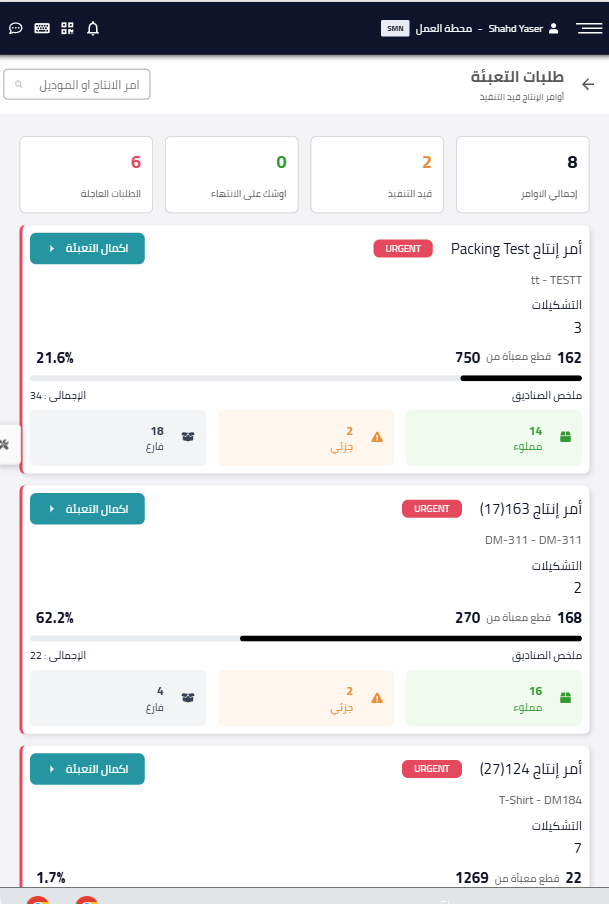 بعد الضغط على زر التعبئة، ستظهر للعامل قائمة بأوامر الإنتاج التي أصبحت جاهزة للتعبئة.