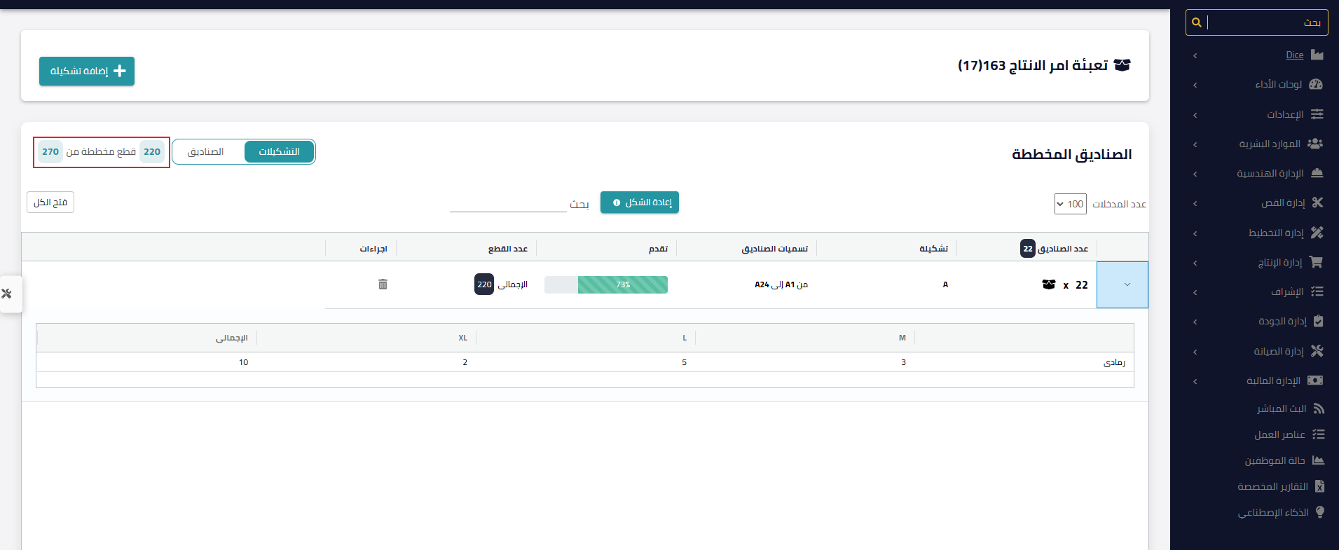 بعد إضافة التشكيلة، سيظهر النظام تفاصيل مثل: