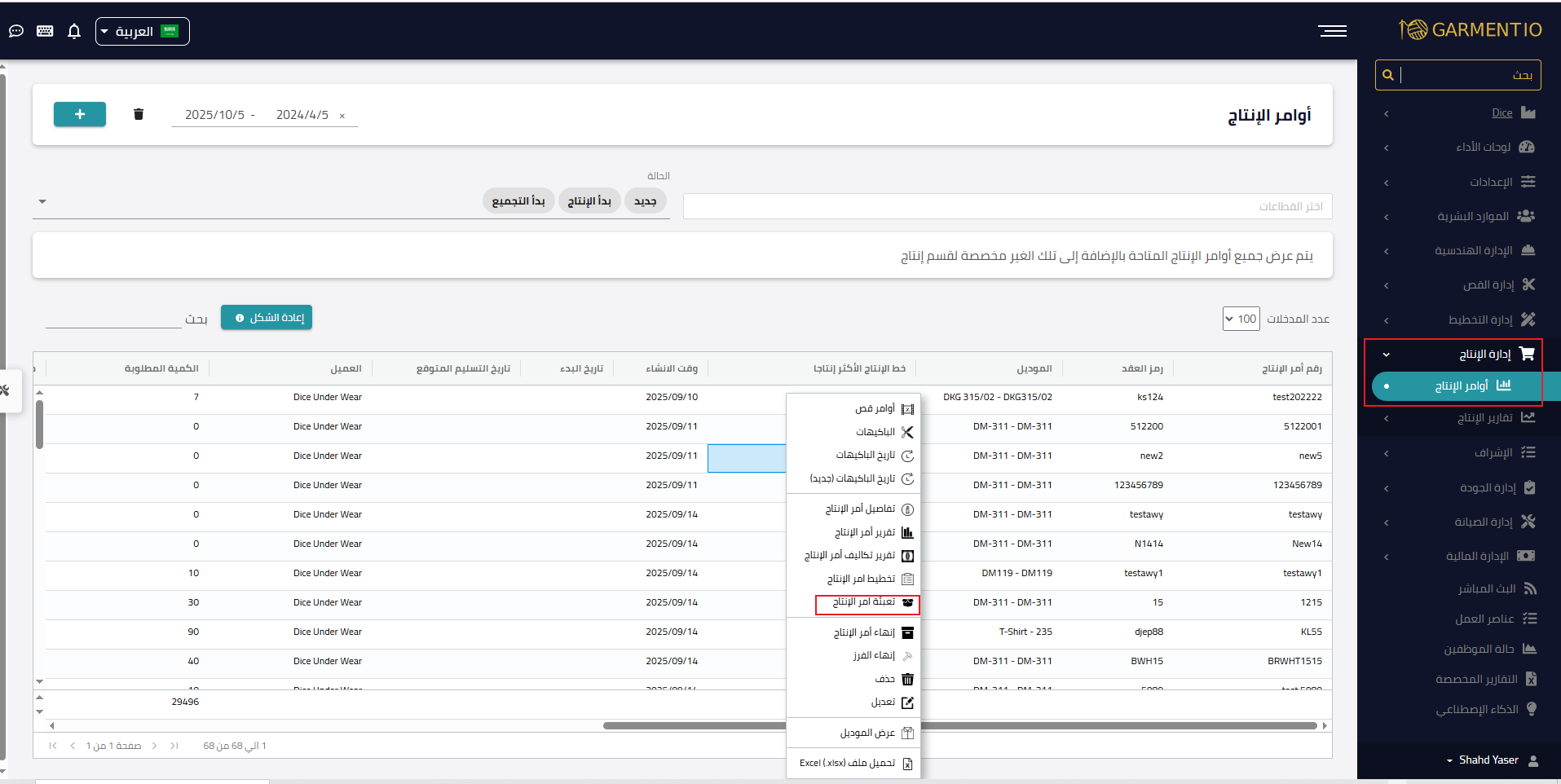 انقر بزر الماوس الأيمن على أمر الإنتاج المطلوب.